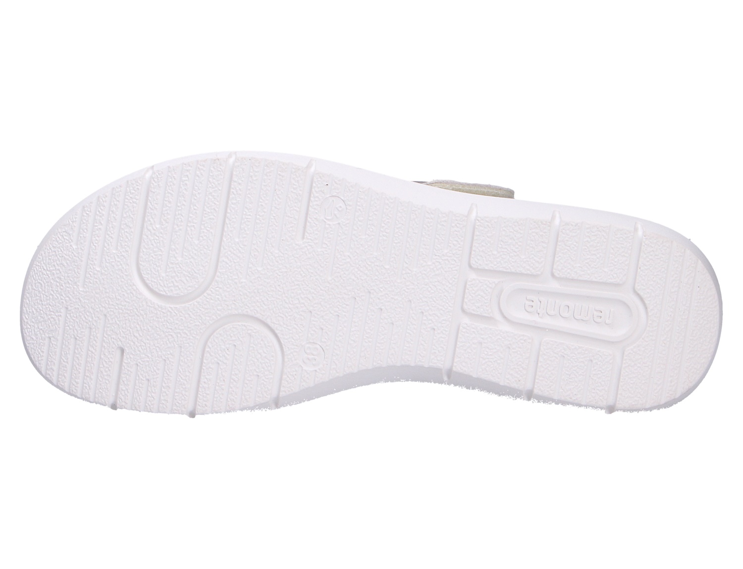 Bequeme Damensandale mit Comfort aus dem Hause Remonte aus einem feinen hochwertigem Nubukleder.Die angeraute Oberfläche ist besonders weich und gibt dem Leder ein angenehmes Gefühl. Auch die textile Innenverarbeitung überzeugt durch ihre angenehm weiche Beschaffenheit. Durch die auswechselbare Decksohle ist es möglich, eigene Einlagen zu verwenden. Geschnitten ist der Schuh für etwas breitere Füße (Weite G). Der Keilabsatz hat eine Höhe von cirka 1 cm ,für gute Bodenhaftung sorgt die abriebfeste und griffige Gummisohle. Klettverschlüsse halten den Schuh sicher am Fuß und sorgen auch für die individuelle und optimale Anpassung. Die Schuhgröße fällt regulär aus.
