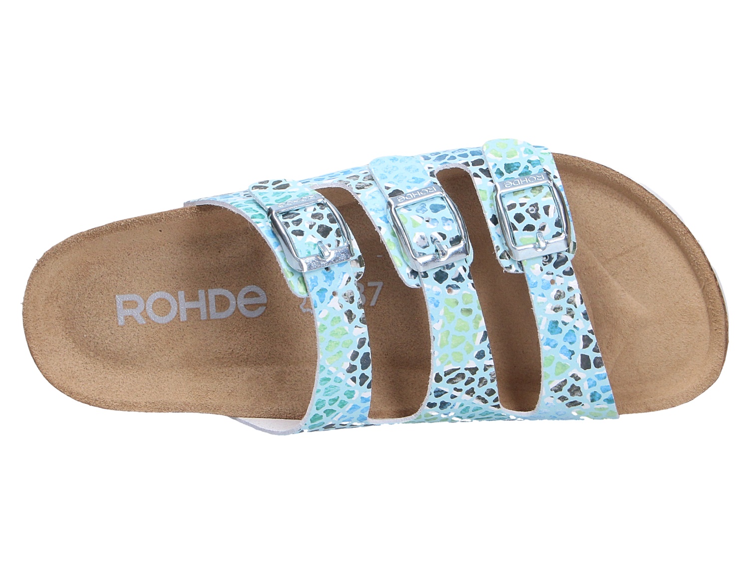 Luftig leichtes gehen mit Comfort die Pantolette SUNNYS N°13 von Rohde Hier wird jeder Fuß verwöhnt. Das Obermaterial ist aus einem feinen hochwertigem Synthetikmaterial. Auch die textile Innenverarbeitung überzeugt durch ihre angenehm weiche Beschaffenheit. Für gutes Fußklima sorgt die lederbezogene Decksohle. Geschnitten ist die Form für normal breite Füße (Weite F). Der Absatz ist durchgehend flach ,für gute Bodenhaftung sorgt die abriebfeste und griffige Gummisohle. Über eine Schließe läßt sich der Schuh bequem an- und ausziehen. Die Schuhgröße fällt regulär aus.
