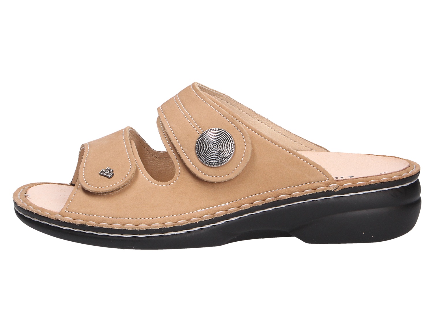 Luftig leichtes gehen mit Comfort die Pantolette SANSIBAR aus dem Hause Finn Comfort Hier wird jeder Fuß verwöhnt. Durch das hochwertige Nubukleder ist das Obermaterial wunderbar anpassungsfähig. Die angeraute Oberfläche ist besonders weich und angenehm zu tragen. Das exzellente Innenleben aus bestem Leder gibt Ihnen ein erholsames Gefühl an langen Tagen. Die lederbezogene, gepolsterte Einlegesohle ist herausnehmbar.Somit können eigene Einlagen verwendet werden. Der Schnitt ist für breitere Füße (Weite H) geeignet. Der Keilabsatz hat eine Höhe von cirka 2 cm ,für gute Bodenhaftung sorgt die abriebfeste und griffige Gummisohle. Klettverschlüsse halten den Schuh sicher am Fuß und sorgen auch für die individuelle und optimale Anpassung. Die Schuhgröße fällt groß aus - bitte eine ganze Größe kleiner bestellen.