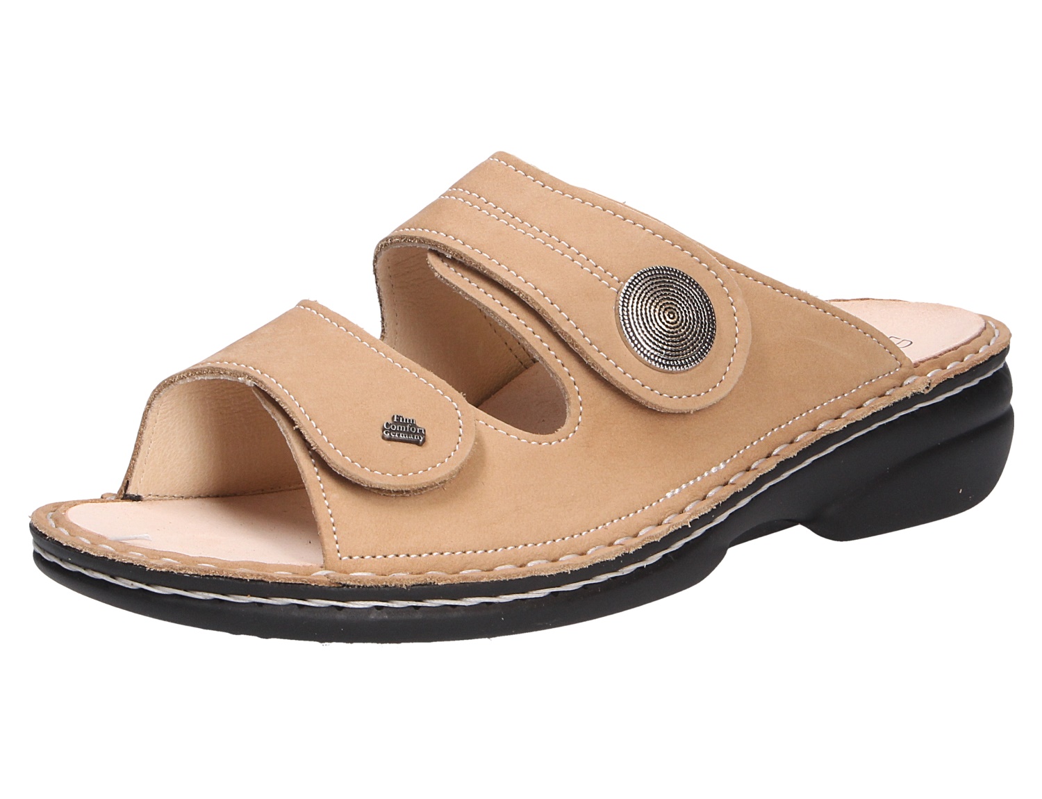 Luftig leichtes gehen mit Comfort die Pantolette SANSIBAR von Finn Comfort Hier wird jeder Fuß verwöhnt. Durch das hochwertige Nubukleder ist das Obermaterial wunderbar anpassungsfähig. Die angeraute Oberfläche ist besonders weich und angenehm zu tragen. Das exzellente Innenleben aus bestem Leder gibt Ihnen ein erholsames Gefühl an langen Tagen. Die lederbezogene, gepolsterte Einlegesohle ist herausnehmbar.Somit können eigene Einlagen verwendet werden. Der Schnitt ist für breitere Füße (Weite H) geeignet. Der stabile Blockabsatz hat eine Höhe von cirka 2 cm ,für gute Bodenhaftung sorgt die abriebfeste und griffige Gummisohle. Klettverschlüsse halten den Schuh sicher am Fuß und sorgen auch für die individuelle und optimale Anpassung. Die Schuhgröße fällt groß aus - bitte eine ganze Größe kleiner bestellen.
