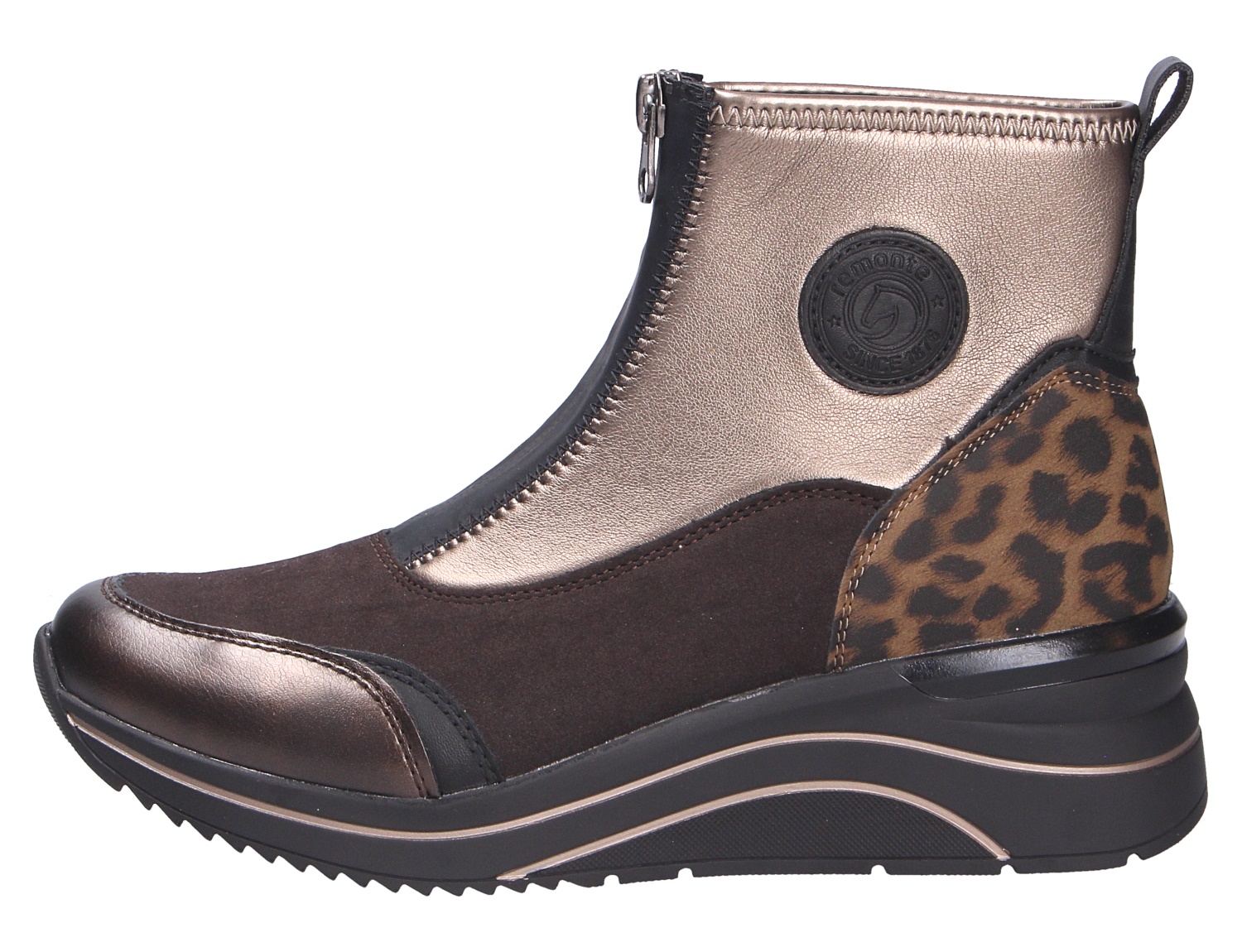 Modisch trendige Stiefelette der Marke Remonte aus einem hochwertigen Materialmix aus Leder und Textil. Auch die textile Innenverarbeitung überzeugt durch ihre angenehm weiche Beschaffenheit. Durch die auswechselbare Decksohle ist es möglich, eigene Einlagen zu verwenden. Der Schnitt ist für breitere Füße (Weite H) geeignet. Der Absatz ist durchgehend flach ,für gute Bodenhaftung sorgt die abriebfeste und griffige Gummisohle. An der Innenseite verfügt der Schuh über einen Reißverschluss, sodass ein schnelles An- und Ausziehen gewährleistet ist. Die medium Schaftweite passt sehr gut für alle normalweiten Waden. Durch die runde Schuhspitze wirkt der Schuh dezent am Fuß und bietet genügend Platz für die Fußzehen. Die Schuhgröße fällt regulär aus.