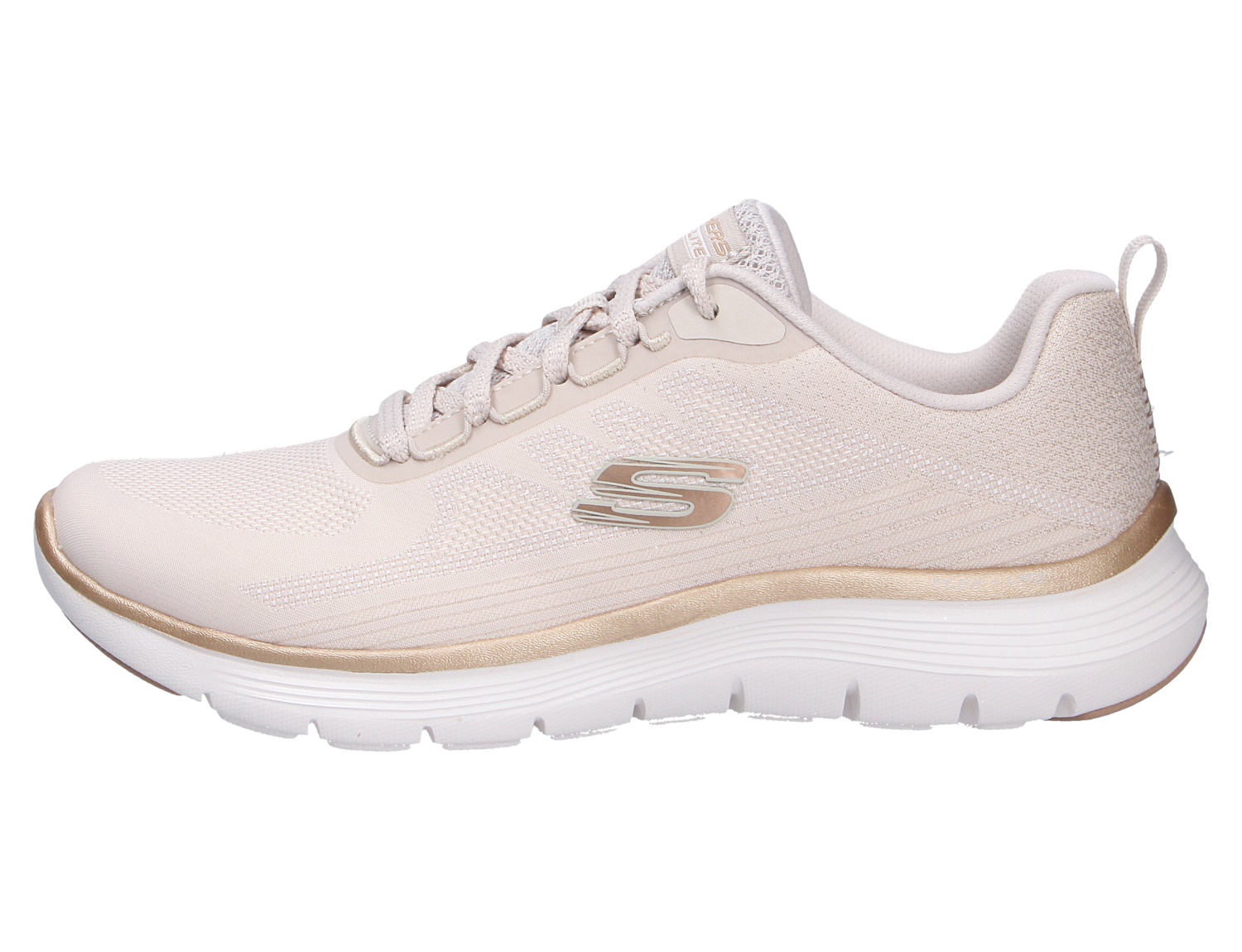 Modisch aktuell und top im Trend: Bei dem Modell FLEX APPEAL der Marke Skechers stimmt einfach alles. Oben besteht der Schuh aus einem weichen Textil. Auch die textile Innenverarbeitung überzeugt durch ihre angenehm weiche Beschaffenheit. Die aus Textil bestehende Decksohle bettet den Fuß angenehm. Geschnitten ist die Form für normal breite Füße (Weite F). Der Absatz ist durchgehend flach ,die aus einem weichen PU-Material bestehende Laufsohle schont die Gelenke und federt jeden Tritt optimal ab. Über den Schnürverschluß ist eine optimale Anpassung an den Fuß möglich. Durch die runde Schuhspitze wirkt der Schuh dezent am Fuß und bietet genügend Platz für die Fußzehen. Die Schuhgröße fällt regulär aus.